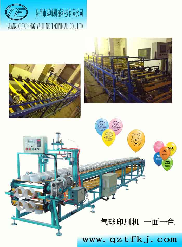 泉州市泰峰机械科技有限公司气球印刷机是一种专门在各种乳胶(橡胶)气球上印上企业(公司)的logo,标志,或者一些图片的机器,可达到推广宣传企业公司,进而为各企业公司带来潜在客户,这种宣传方式已成为时下相当流行的宣传公司信息的方式之一、为气球印刷行业做出了功不可没的贡献。
